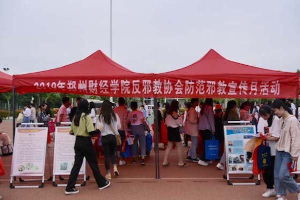 启动仪式现场 郑州财经学院反邪教协会秘书长王杰、干事李丹带队参加启动仪式。活动现场,我校反邪教协会摆放宣传展板,向到场的领导和学生发放反邪教知识宣传册、反邪教手提袋等宣传品,并现场讲解宣传反邪教知识。
